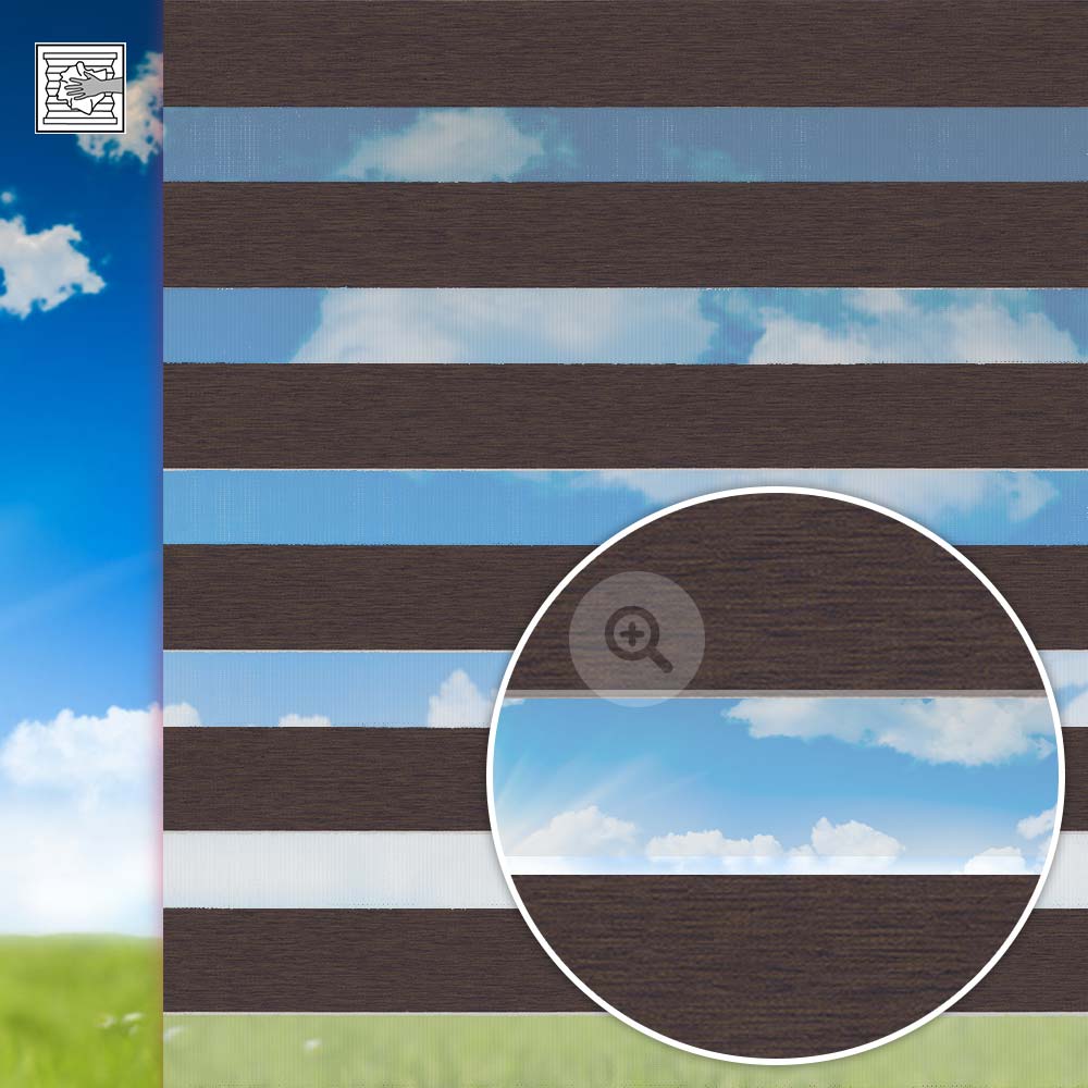 Schöne und funktionale Doppelrollo Anlage des Marktführers Duoflor. Lassen Sie viel Licht herein, aber Blicke effektiv draussen. Die Streifen dieses Doppelrollos sind abwechselnd braun (Höhe: 7,5 cm) und transparent (Höhe: 5 cm).