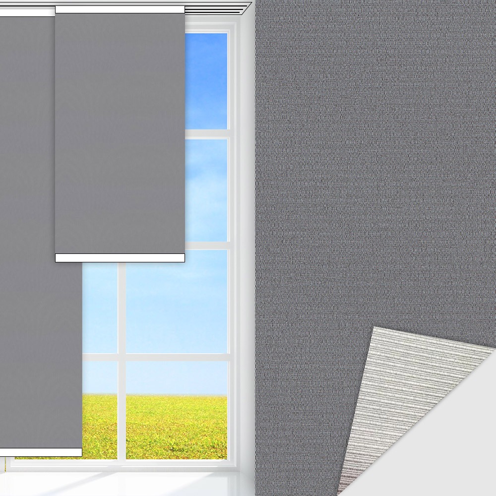 Grundprofil aus hochwertigem Kunststoff. Stranggepresstes Design-Profil aus Aluminium zur einfachen und geraden Montage der Stoffpaneele. Roller mit sehr guten Laufeigenschaften. T- Und L- Mitnehmer zum Verbinden der Paneele untereinander (auf Anfrage).