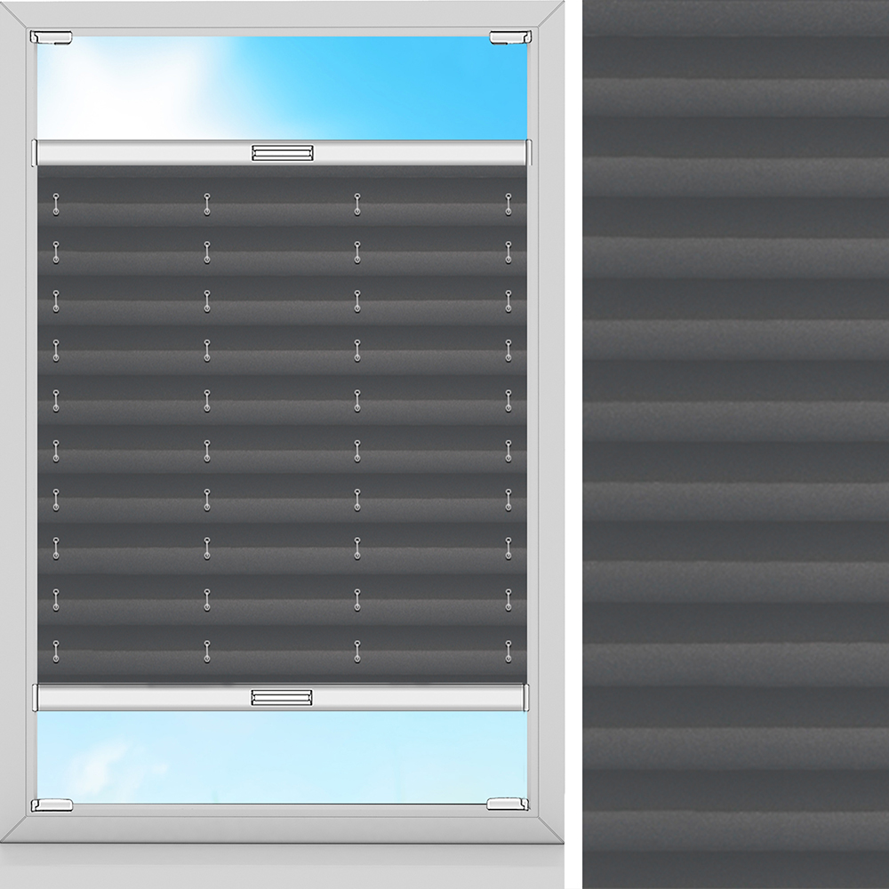 Hochwertige, schwarze Plissee. Lässt Licht herein und Blicke draussen. Der ideale Sichtschutz für Ihr Zuhause. Maximale Breite des Stoffes: 230 cm. Dank der Perlmuttbeschichtung auf der Rückseite kann Schmutz nicht haften und Sonnenstrahlen werden reflektiert. Bei maximal 30°C ist Handwäsche möglich.