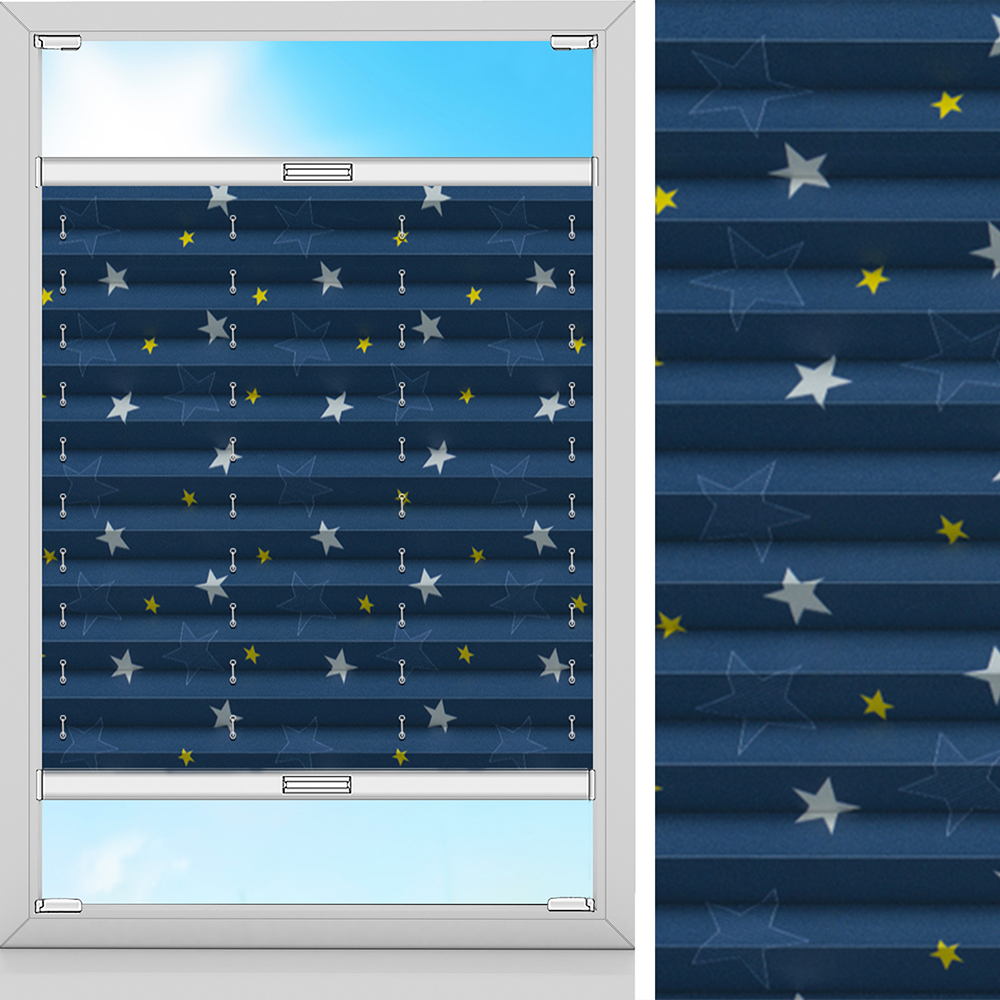Hochwertige, blaue Plissee. Bei diesem Stoff kommt kein Licht durch. Ideal geeignet, um im Schlafzimmer für Dunkelheit zu sorgen. Sehr gute Temperaturdämmung im Winter und Sommer möglich. Maximale Breite des Stoffes: 199 cm. Stoff mit eingewebten Muster. Stilrichtung: Natur.