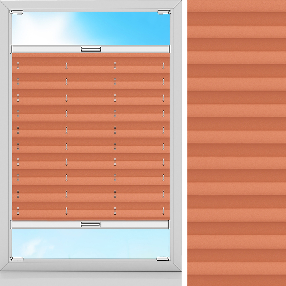 Hochwertige, orange-farbene Plissee. Bei diesem Stoff kommt kein Licht durch. Ideal geeignet, um im Schlafzimmer für Dunkelheit zu sorgen. Gute Temperaturdämmung bei korrekter Handhabung möglich. Maximale Breite des Stoffes: 230 cm. Dank der Perlmuttbeschichtung auf der Rückseite kann Schmutz nicht haften und Sonnenstrahlen werden reflektiert.