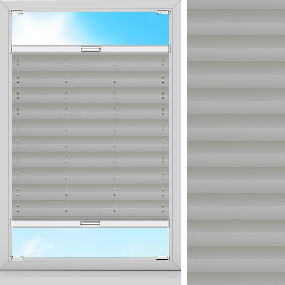 Hochwertige, graue Plissee. Hilft, den Raum zu verdunkeln. Sehr gute Temperaturdämmung im Winter und Sommer möglich. Maximale Breite des Stoffes: 230 cm. Dank der Perlmuttbeschichtung auf der Rückseite kann Schmutz nicht haften und Sonnenstrahlen werden reflektiert. Dieser schwer entflammbare Stoff ist für den Einsatz im Objektbereich (öffentliche Einrichtungen) geeignet.