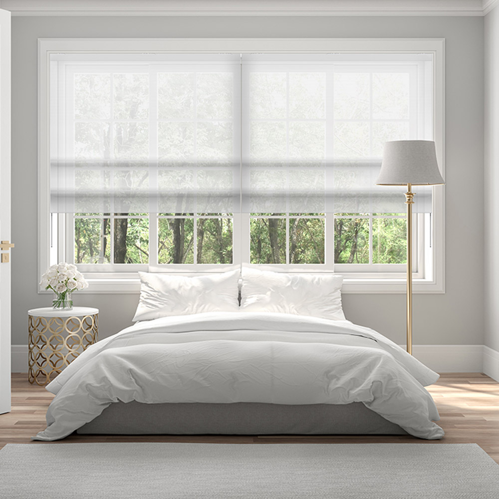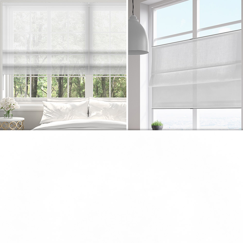 Hochwertiges weisses Raffrollo. Halbtransparenter Stoff für Dekozwecke. Ideal für den Brandschutz geeignet (schwer entflammbar).