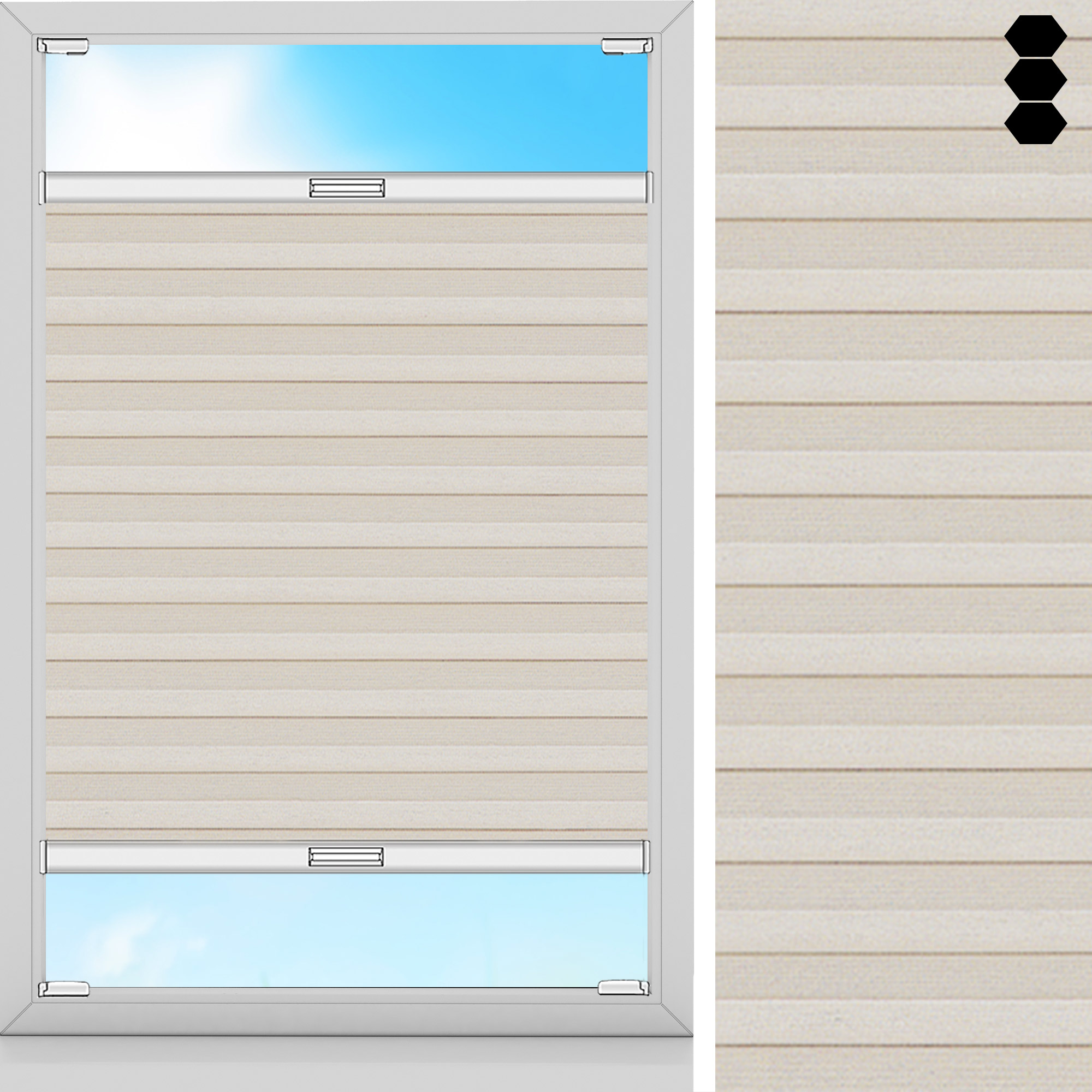 Hochwertige, creme-farbene Waben-Plissee. Besonders energie-effizienter Plissee-Stoff dank Wabenform. Lässt Licht herein und Blicke draussen. Der ideale Sichtschutz für Ihr Zuhause. Dieser Stoff verfügt über gute temperaturdämmende Eigenschaften. Maximale Breite des Stoffes: 295 cm.