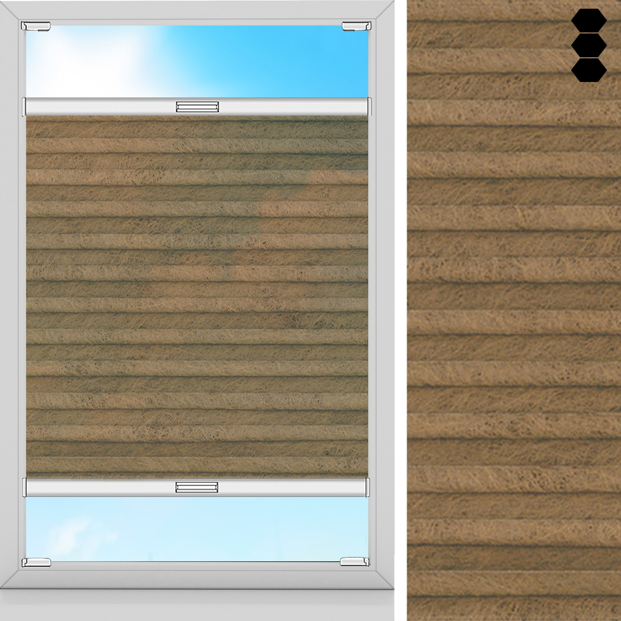 Hochwertige, braune Waben-Plissee. Besonders energie-effizienter Plissee-Stoff dank Wabenform. Reiner Deko-Stoff, um Ihr Zuhause zu verschönern. Lässt Blicke und Sonnenstrahlen fast ungefiltert durch. Maximale Breite des Stoffes: 295 cm.